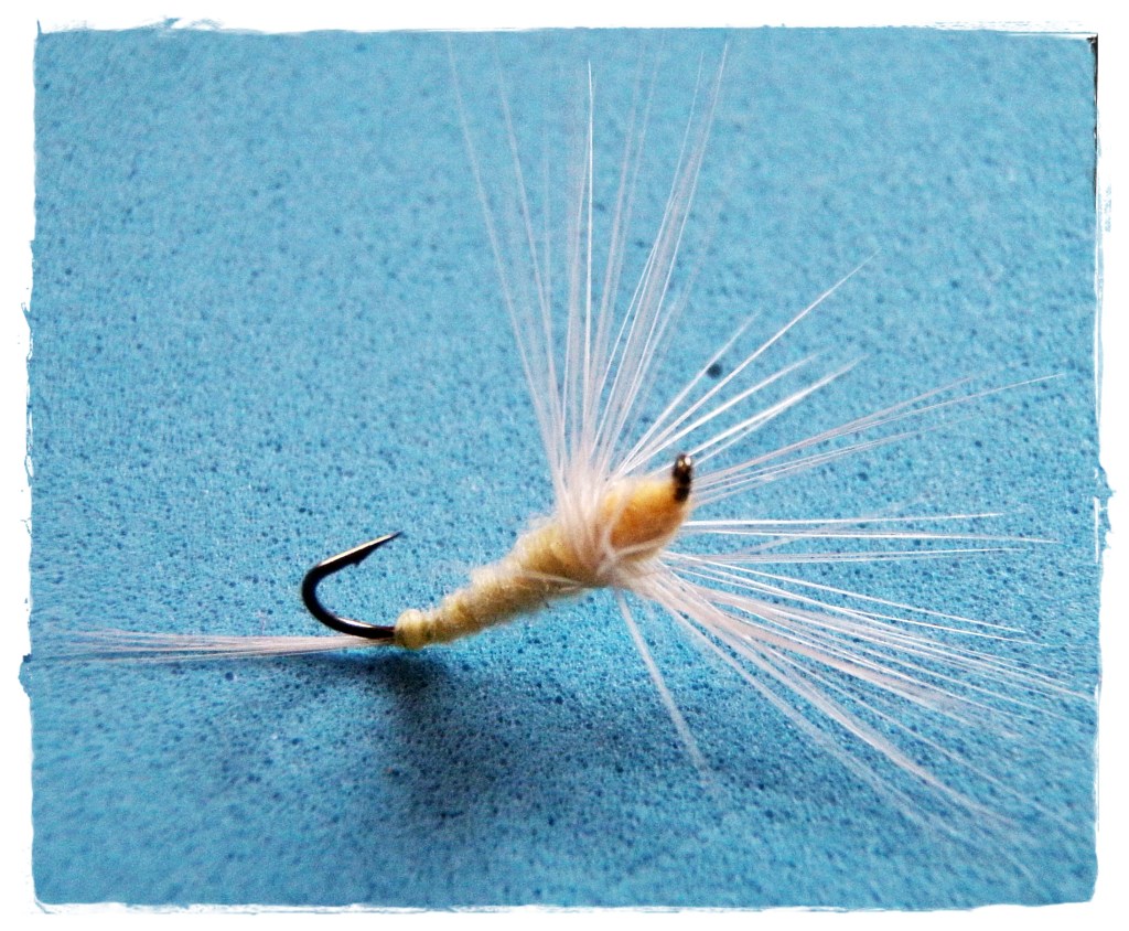 The over-sized hackle is tied in at about the one-third mark on the hook shank, then a thorax of dubbing is installed on the front third of the hook. Wrap the hackle and then use thread wraps to “funnel” the hackle forward over the thorax (which will support it). Wrap in a hackle-fiber tail – this needs to be wrapped a bit around the bend of the hook, so that the fly sits on the hackle and tail properly (as in the picture). The body is then dubbed from front to back and the fly is whip-finished at the tail end. The hackle can be clipped in a “V” on top (as it sits in the vice), this will of course be the bottom of the fly when it turns upside-down. I didn’t clip the hackle on these flies pictured, as they seemed to land and rest just fine without the hackle trimming. Due to the elongated hackle profile – you may want to tie these flies on one hook size smaller than usual.