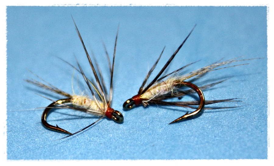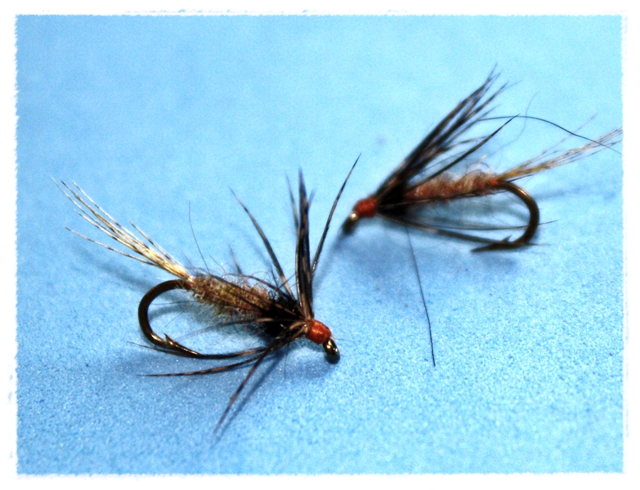 Sulphur nymph wet fly: This is based on a basic sulphur nymph pattern with a black wing-case to suggest a nymph about to “hatch”. In this version I simply used black fur abdomen and a wet fly style collar of grouse hackle instead of a wingcase and legs.