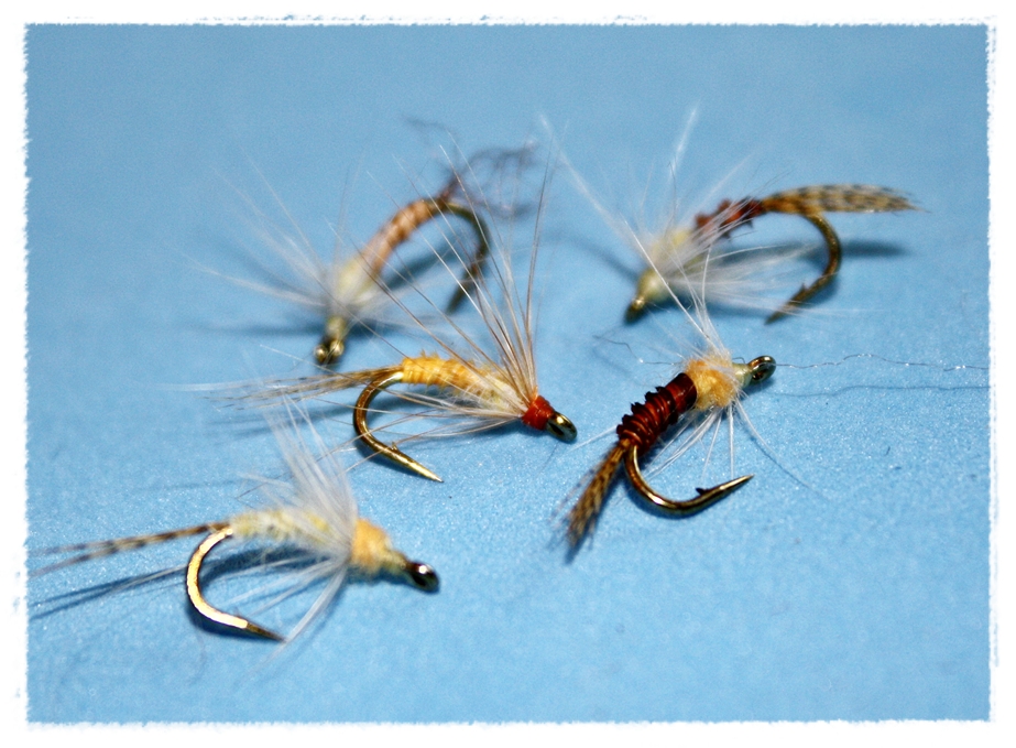 This is a selection of soft-hackle emergers, all but the bottom left fly are tied with biot bodies. They represent a range of emergence states.