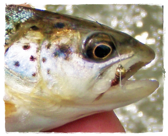 The shop-vac was my magic fly. The problem with magic flies is that they always run out, especially if they’re nymphs. Magic is fleeting and hard to contain. Sometimes we are the aerial that attracts the magic and for a brief time we are the king of the stream, catching fish when nobody else is (no that that matters to us high-brow fly anglers), but then we lose the last magic fly…and then what? The problem for me when a fly is working so well is that when I have run out of that fly I can’t decide what to put on next. I put on this then that then another thing, then panic sets in and I lose all confidence and just go through the motions casting with no heart and no conviction, telling myself that I need to go home and tie more size 16 shop-vacs! And then…finally a fish takes pity and eats another fly, in this case it’s a fly I call the big-fat caddis. I tied them up to match a hideously fat and juicy looking caddis larva that I found on the Yampa at Stagecoach.