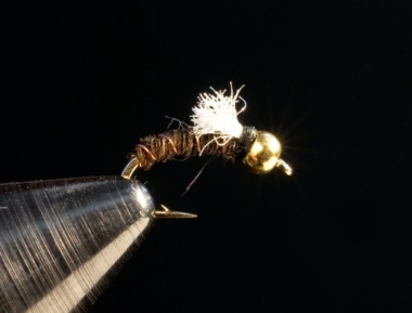 I think it looks pretty realistic when wet and a couple of fish thought so too. It’s basically just bunny fur with gold ribbing and a head of dark brown dyed bunny with some hares mask mixed in for legginess. After ribbing with the tinsel rough it up a little.