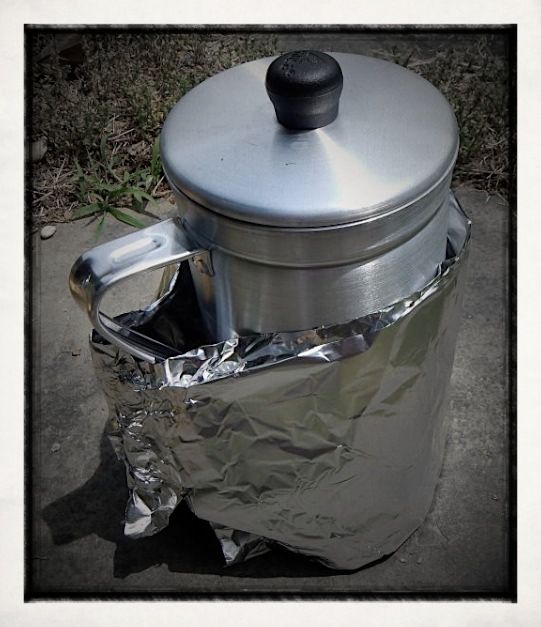 I bought a 1.5 Litre grease pot from Wal-Mart to go with my alcohol stove – these seem to be a popular choice with some alcohol stove users. It is a light aluminum pot with a lid, handle and strainer. Most importantly it’s very cheap ($7). The handle is metal and directly connected to the pot – so it is not useable when the pot is hot. You’ll need a pot holder or a leather glove or a pot grabber to go with it. I bought an aluminum pot grabber to use with it for $4. The pot also makes a nice storage container for the stove, windscreen and pot grabber.