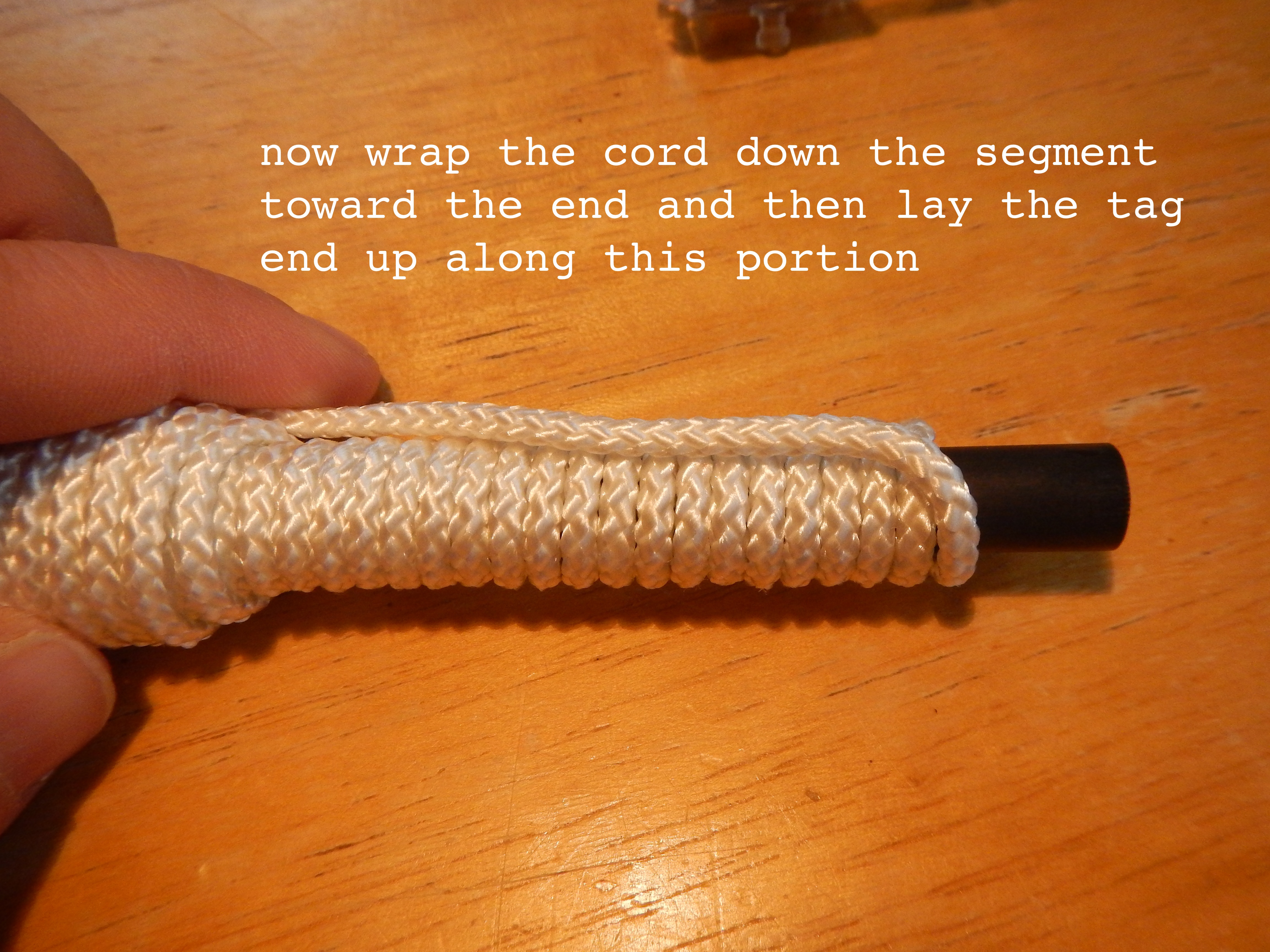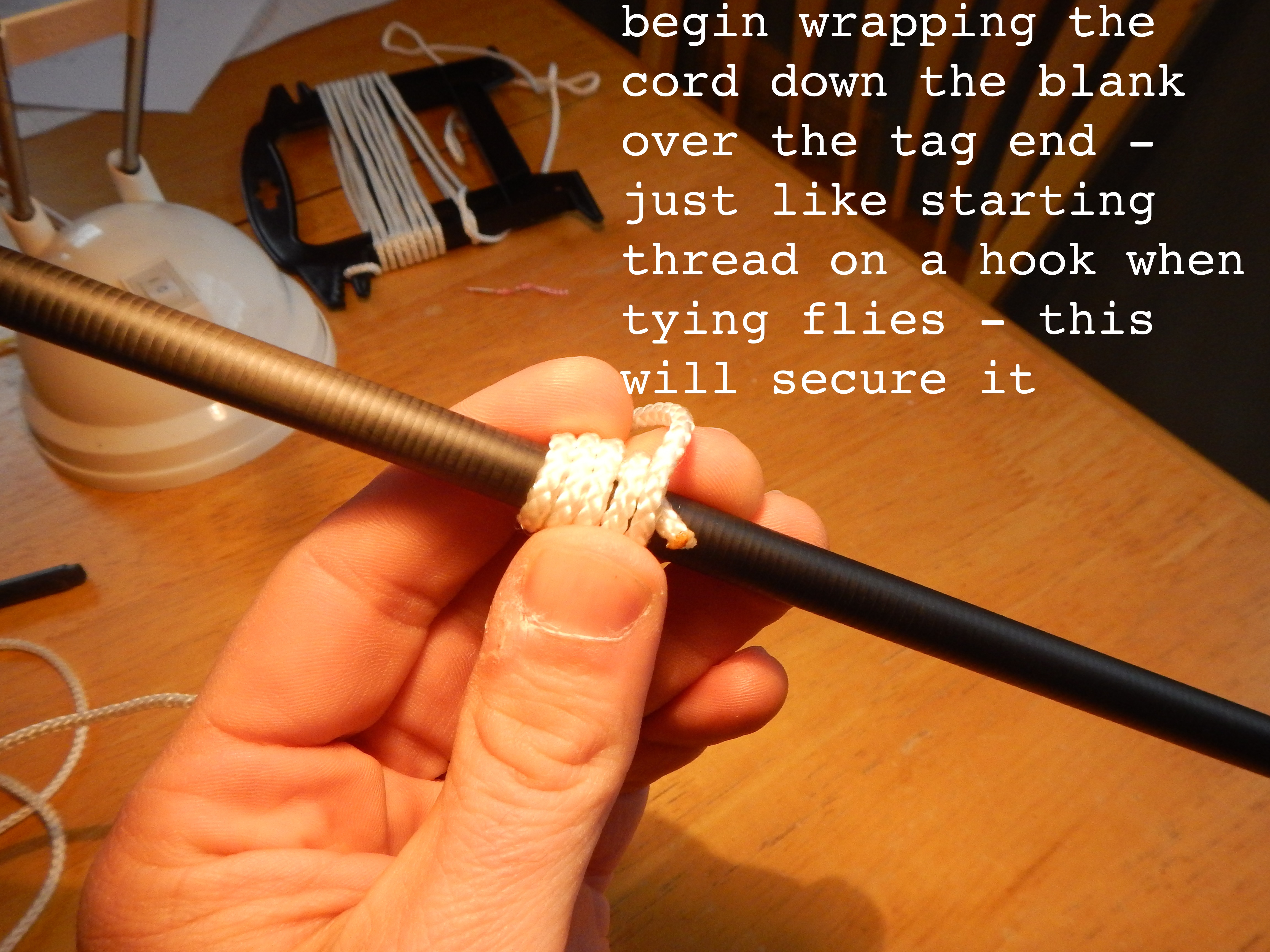 Lay a short portion of the cord along the rod segment, with the working end of the cord above and then wrap over this as you wrap down the rod for the first layer – just like starting thread when tying a fly. This will secure the end of the cord.