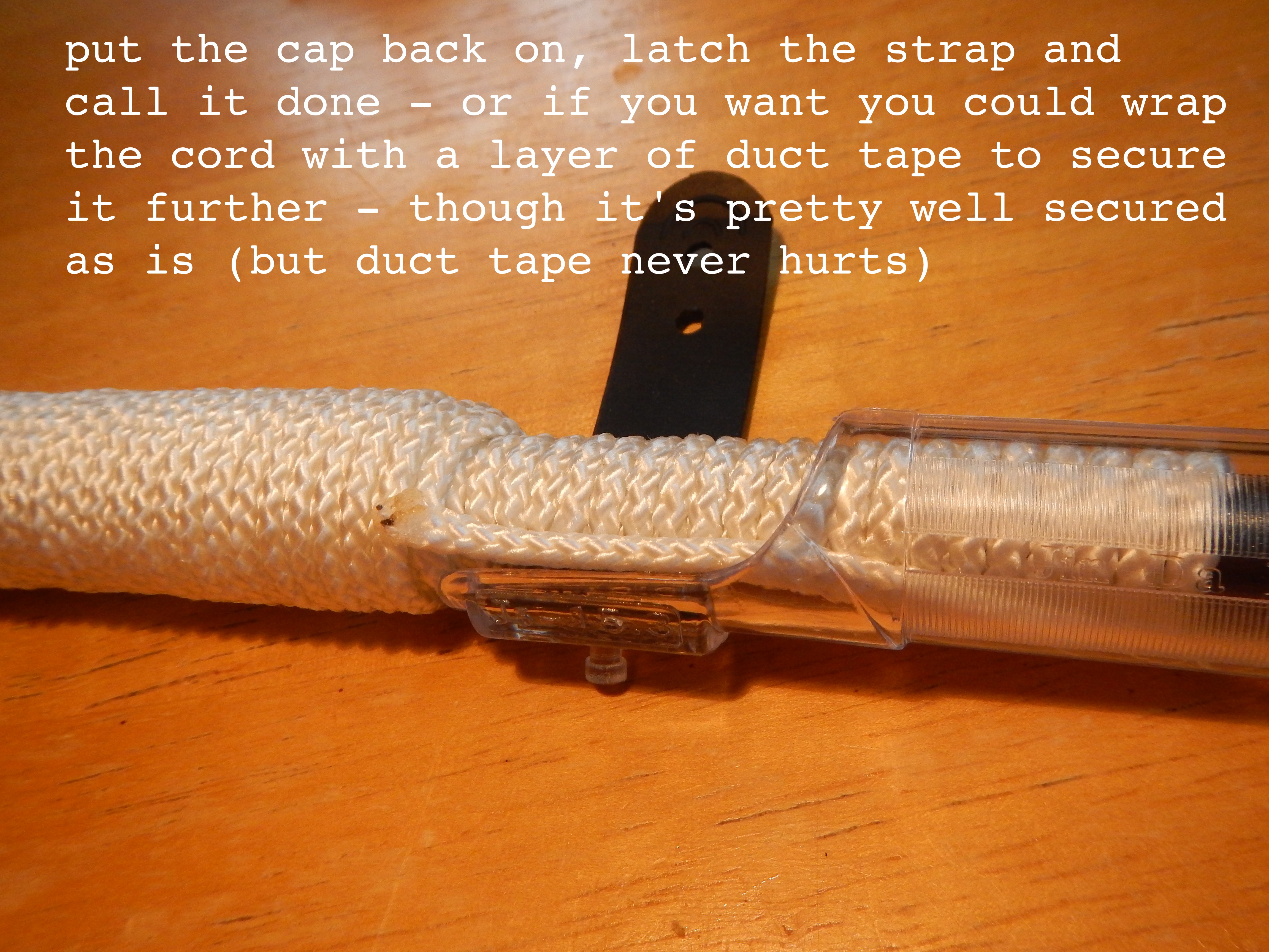 The materials are simple: the rod segment you’re using as the handle; 25′ of 1/8″ cord; and a universal tenkara rod cap. I’m using the second segment – but I imagine you could even use the third if you wanted the rod to be shorter yet. Depending on exactly how you make you make your handle, and what cord you choose, you may need a different length. The universal cap can be found with an internet search. You’ll find some slightly different options out there. The cap that I happened to have has two holes in the strap which is nice because it can be tightened to different diameters. The strap is flexible though and will stretch to fit. You can find caps that I have at Blue Ribbon Flies for $7.50 – also TenkaraBum has some options. Or you could easily eliminate the rod cap altogether and just use some duct tape. I like the idea of avoiding a disposal item like tape – and going for the reusable rod cap though.