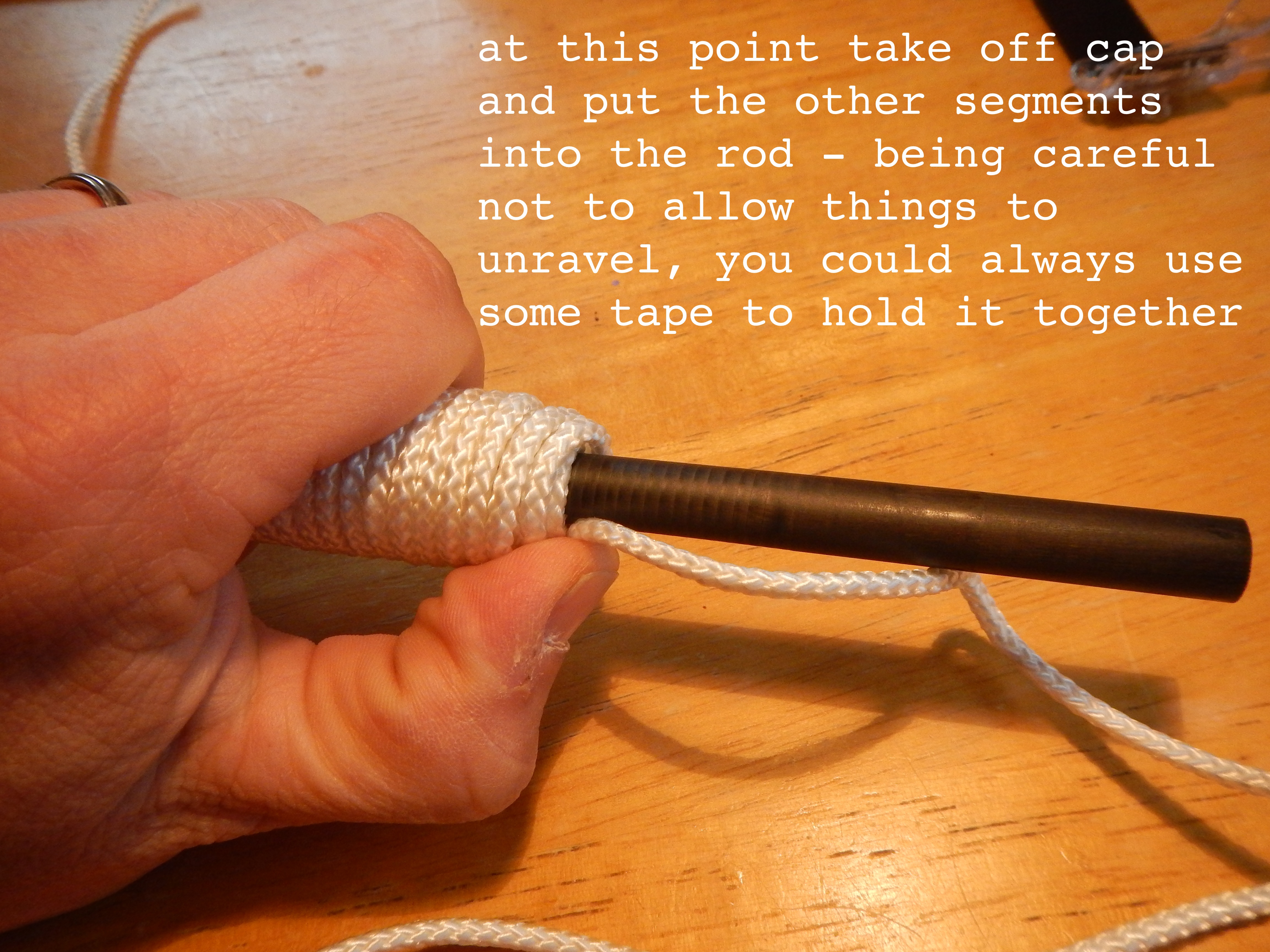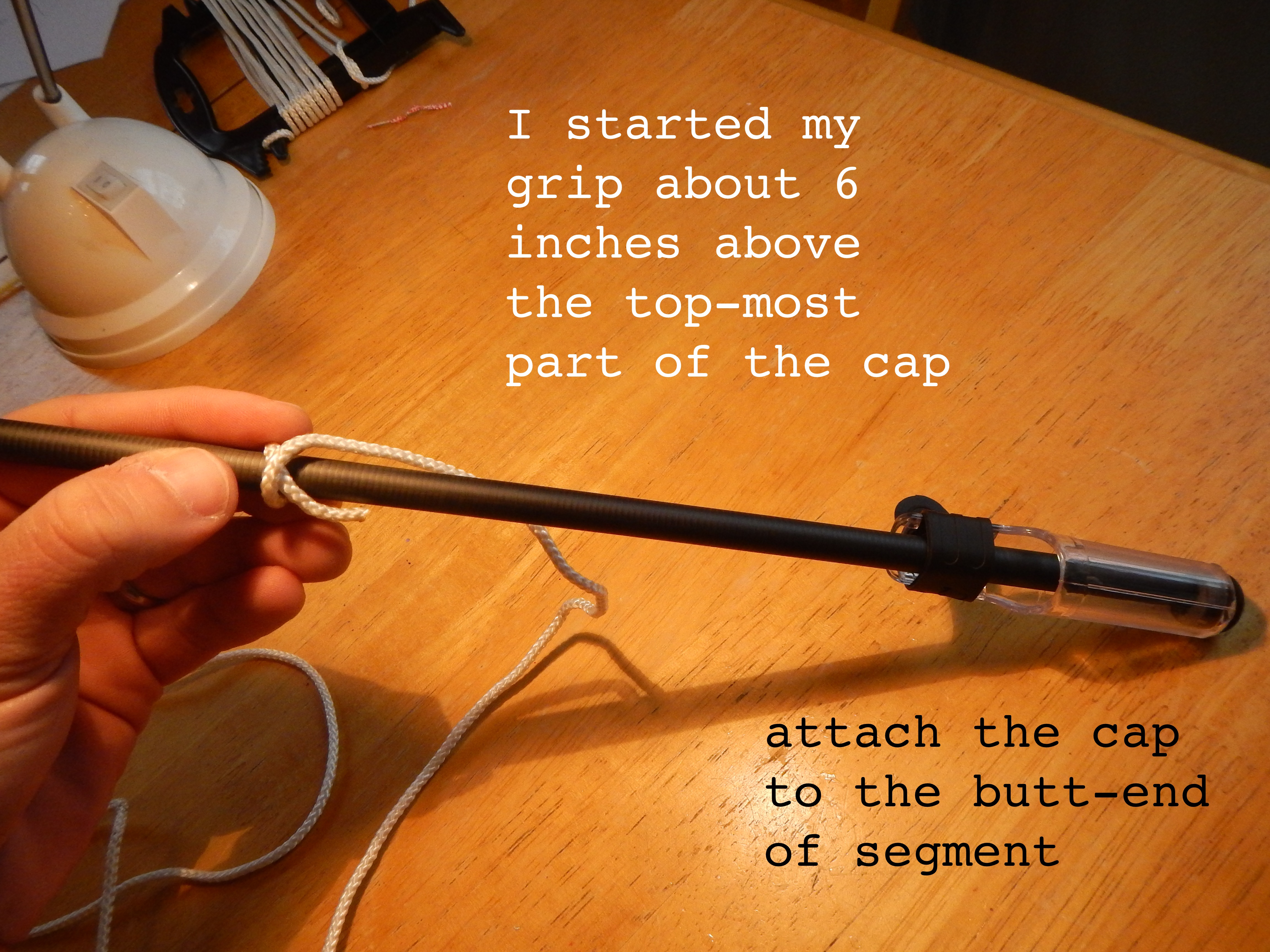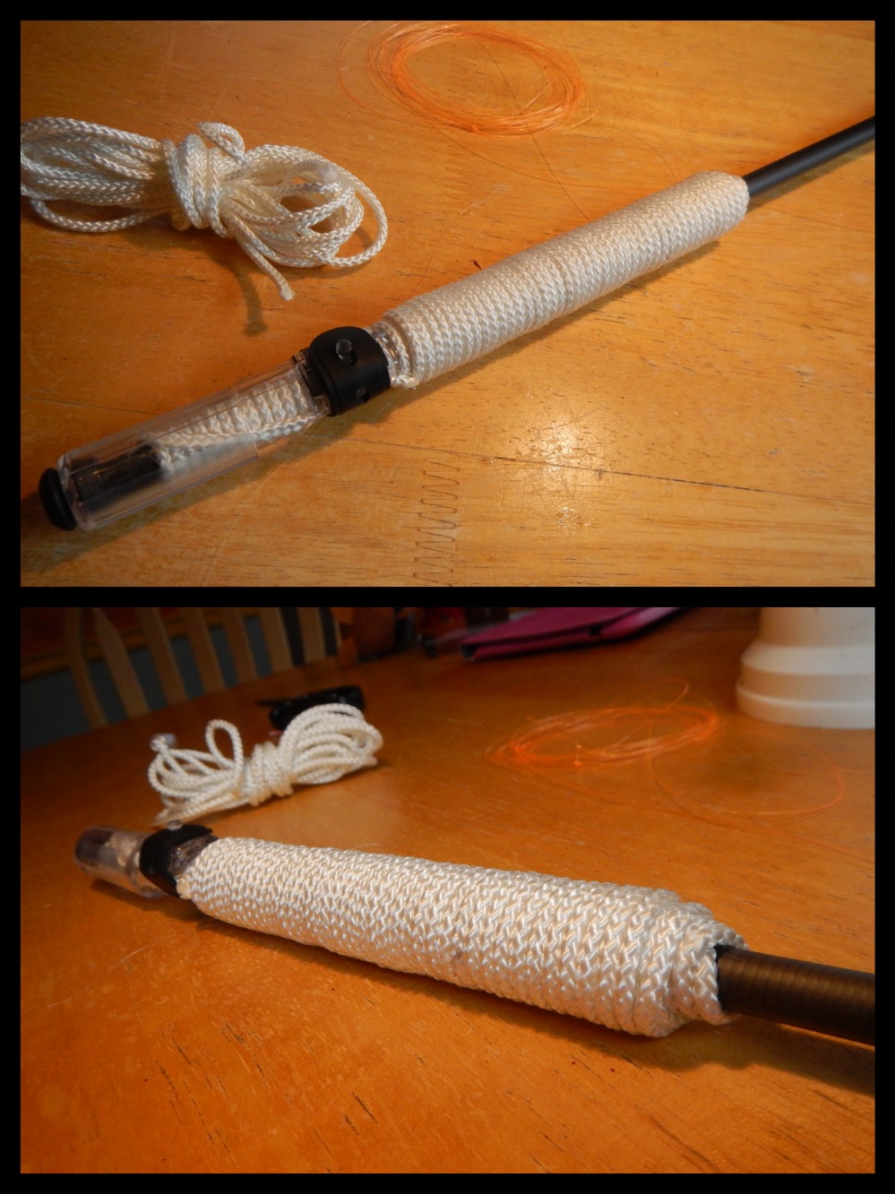 Make sure to remove the remaining rod segments from the handle section. Put the cap on the butt-end. I started my handle wrap at the top because I wanted to have three layers of cord for the grip (for the right thickness) and I wanted the cord wrapping to stop at the bottom end so that I could secure the tag-end of the cord with the cap.