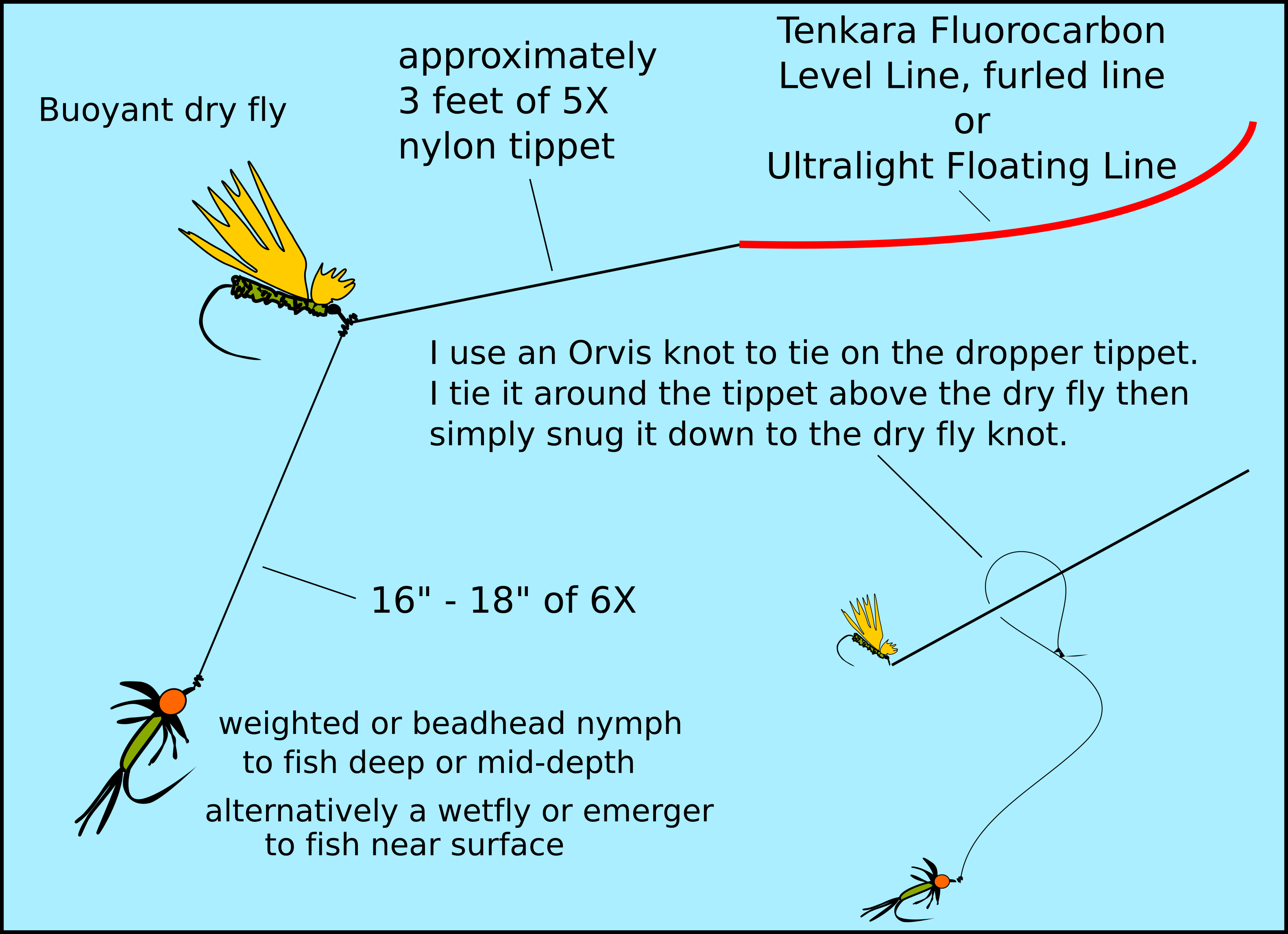 In short all that I’m talking about when I say “Dry-Dropper” rigging is to fish a dry fly with a subsurface fly of some sort tethered to it and drifting underwater below it. The subsurface fly can be a nymph, emerger or wet-fly. Essentially the dry fly is acting as a suspension strike indicator— that is a bobber. With one advantage that if the fish strikes at the bobber you may actually hook it.